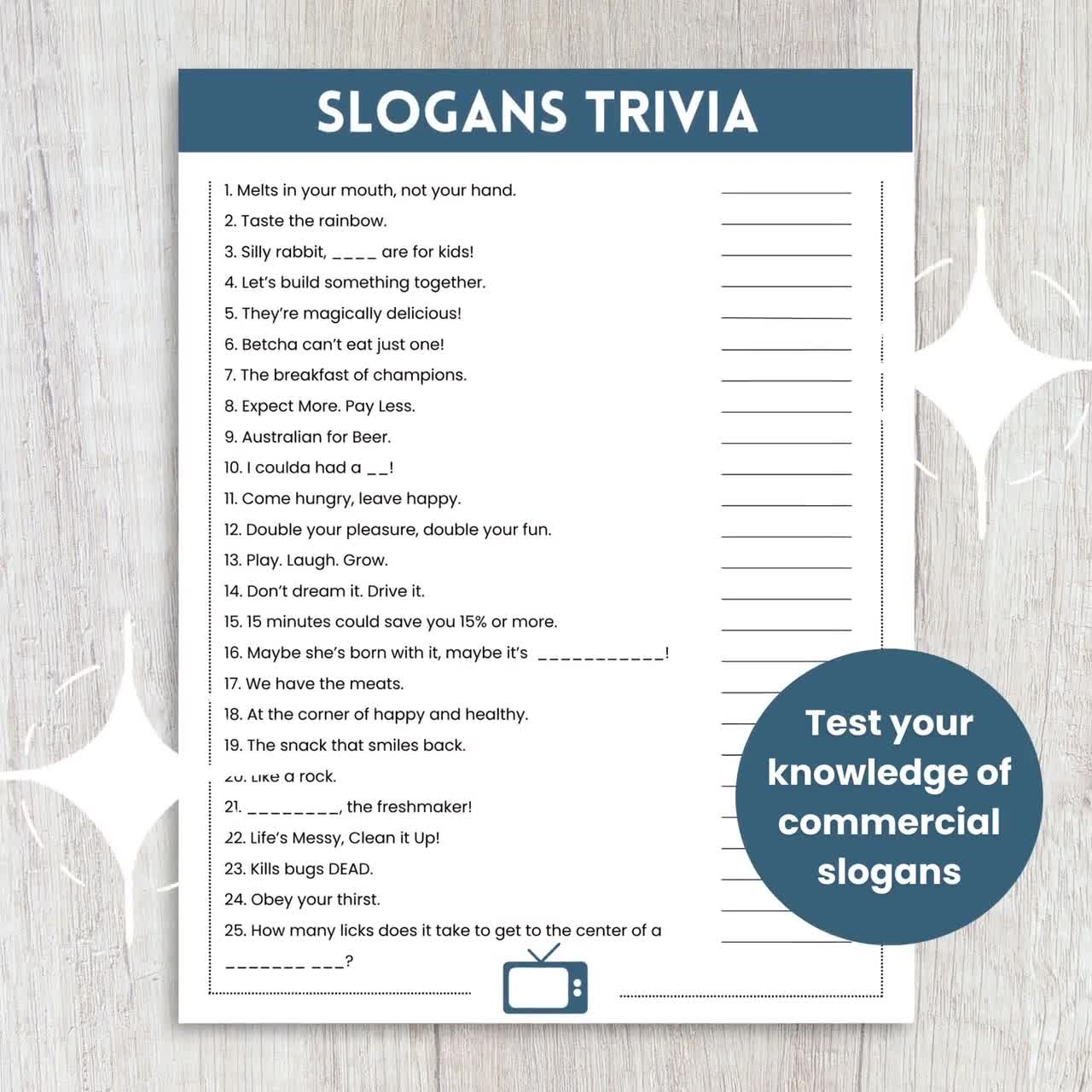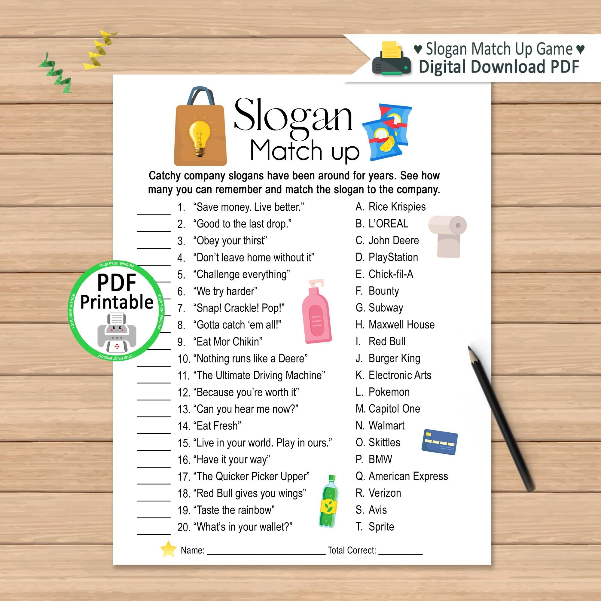 Get ready to put your slogan knowledge to the test with printable company slogans trivia games. Challenge your friends to see who can guess the most slogans correctly and enjoy a night of laughter and friendly competition.
