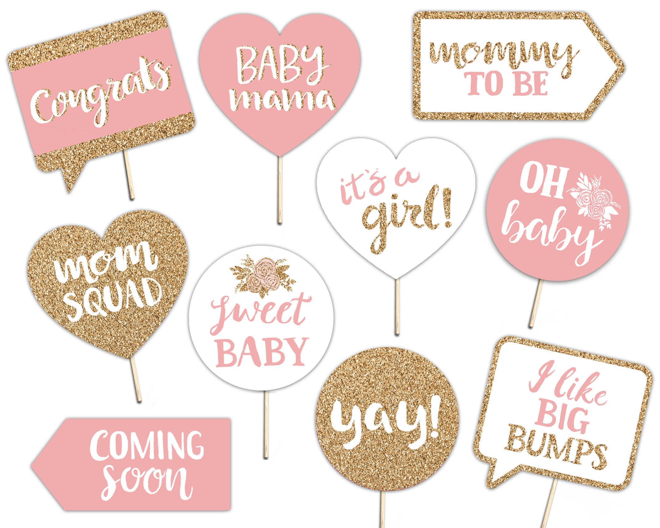 Baby Shower Printable Photo Booth Props Baby Girl Gold Pink And White 10 Hand Painted Signs Etsy