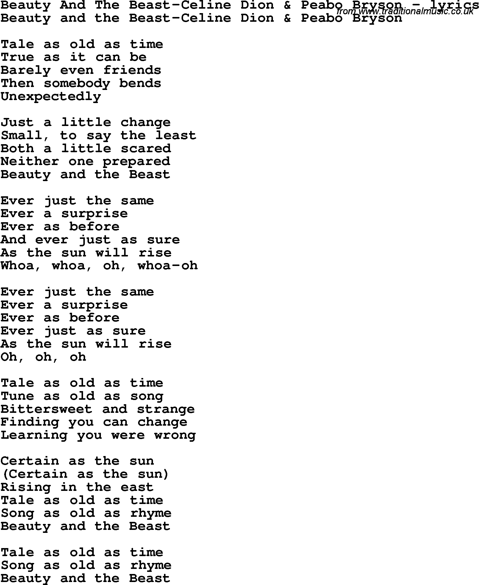 Love Song Lyrics For Beauty And The Beast Celine Dion Peabo Bryson