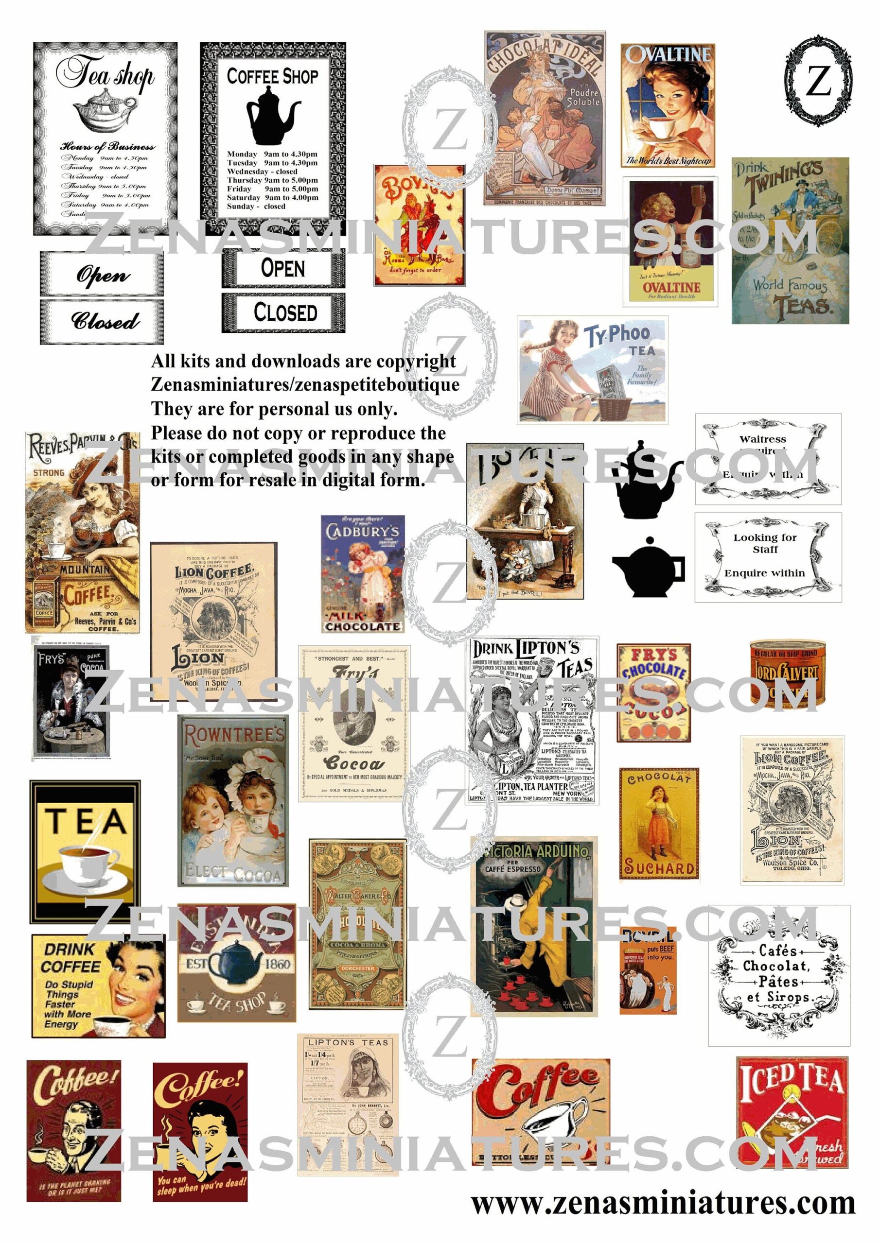 Dollhouse Tea Room coffee Shop Download Pdf printie KIT Miniature 1 12th Posters adverts Etsy