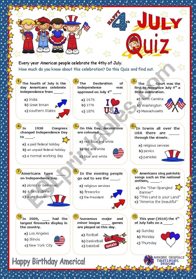 There are many websites online that offer free printable quizzes related to the Fourth of July. You can find quizzes about the history of Independence Day, famous American landmarks, traditional foods, and much more. Simply print out the quizzes and start answering the questions!