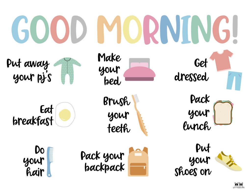 Our printable morning routine includes simple tasks like brushing teeth, getting dressed, eating breakfast, and packing their school bags. Each task is accompanied by cute illustrations to make it fun and engaging for kids.