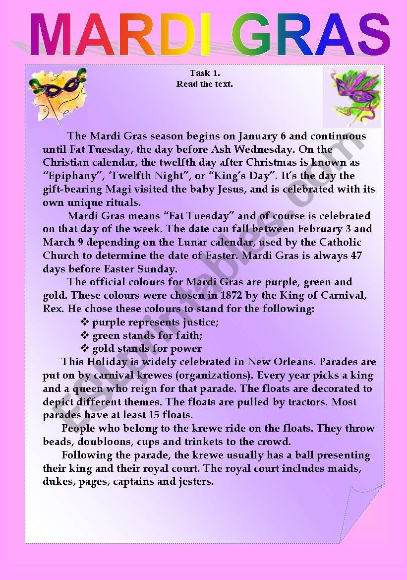 HISTORY OF MARDI GRAS ESL Worksheet By Picheleira