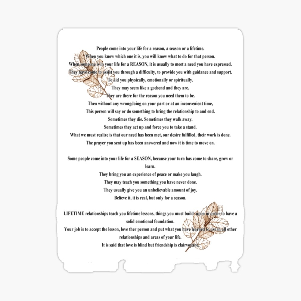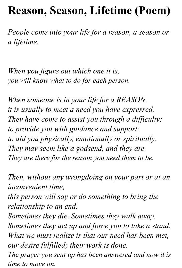 The “Reason, Season, Lifetime” poem reminds us that everyone who enters our lives does so for a specific purpose. Some people are meant to teach us valuable lessons, others to bring us joy and laughter, and still others to stay with us for a lifetime.