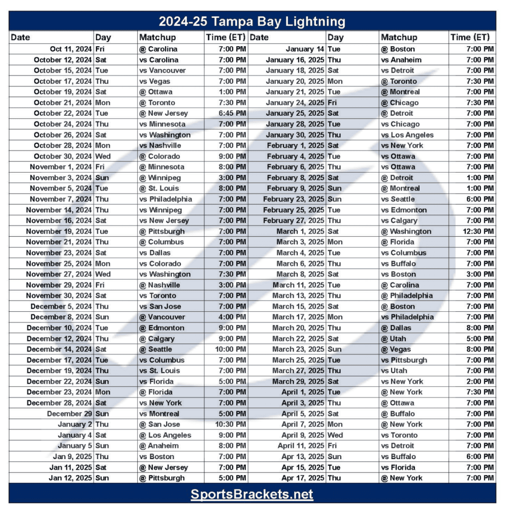 2024 25 Tampa Bay Lightning Schedule Printable PDF Format Sports Brackets