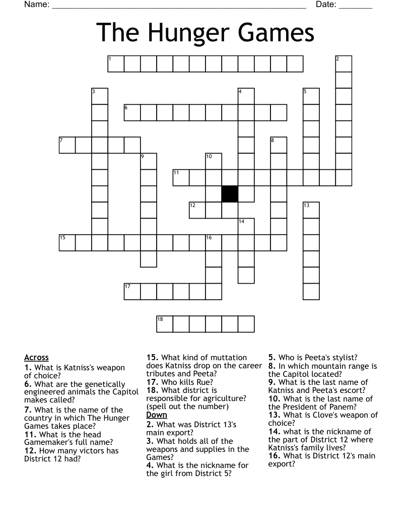 Whether you’re a tribute from District 12 or a Capitol citizen, this crossword puzzle is sure to provide hours of entertainment. Challenge yourself to see how quickly you can fill in all the clues, from characters like Katniss and Peeta to key plot points and memorable quotes.