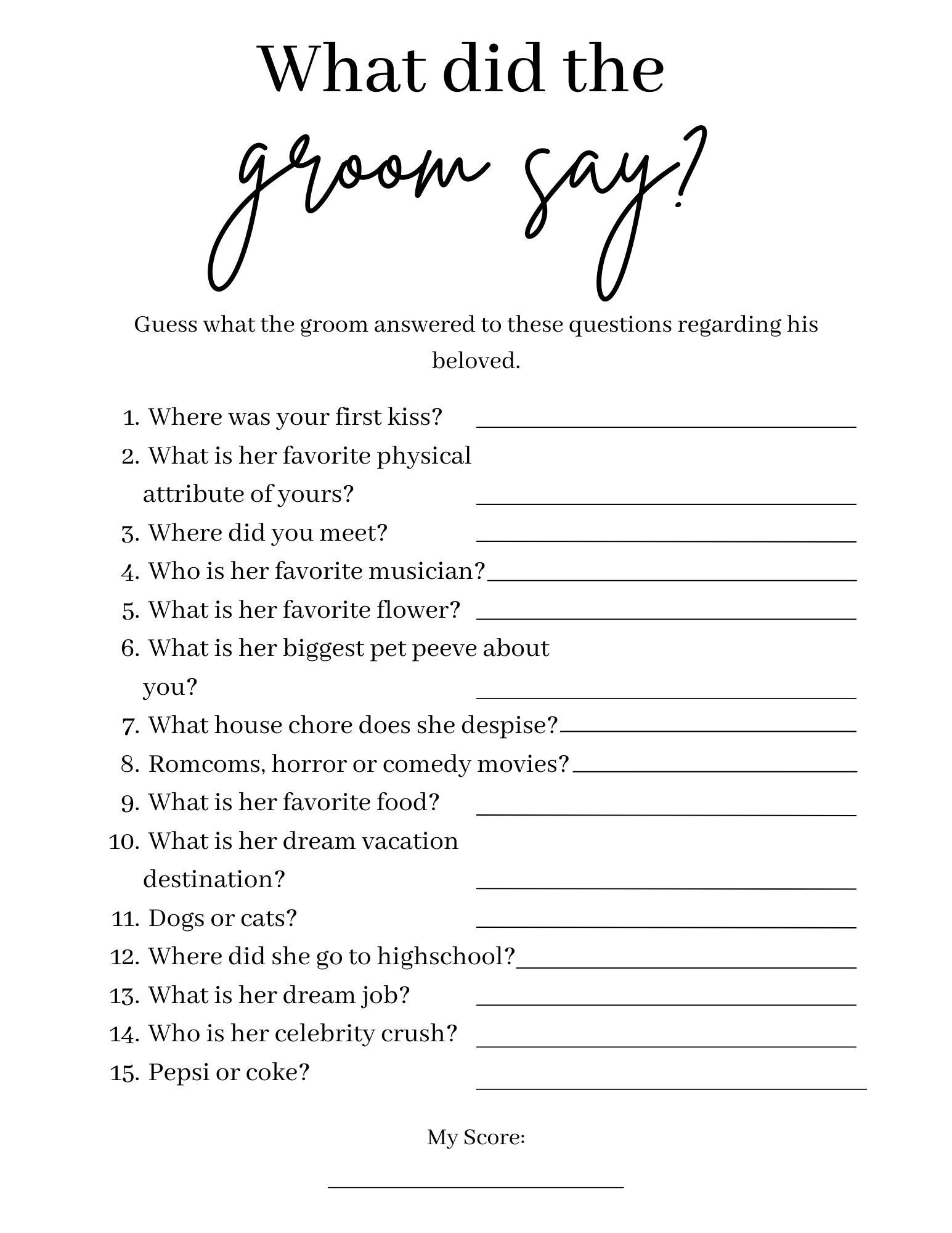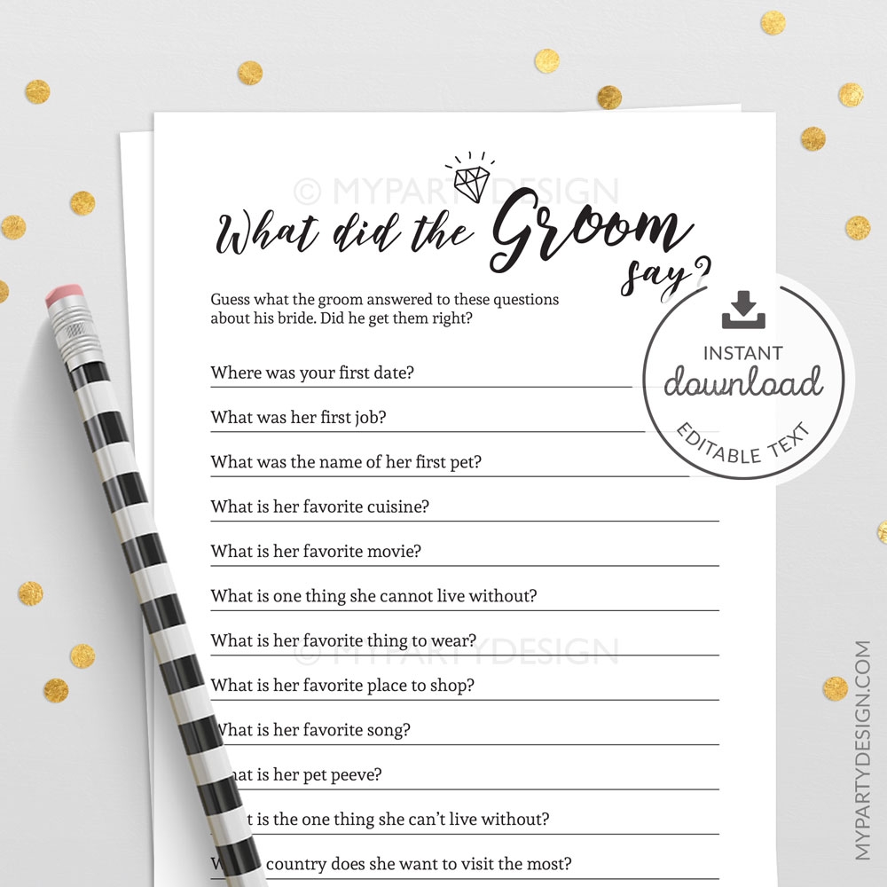 To play this game, simply download and print out the free templates available online. The templates usually consist of a list of questions about the bride and groom, with blank spaces next to each question for guests to fill in their guesses for the groom’s responses.